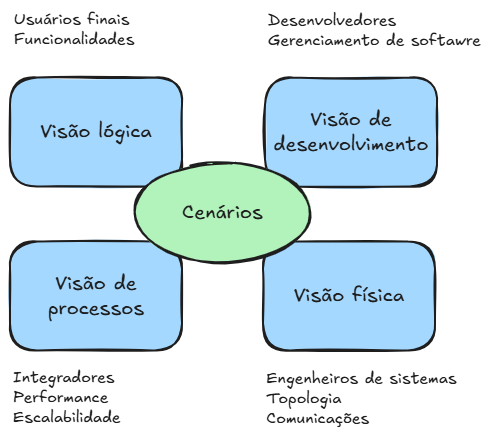 Visão de cenários (casos de uso): integra as demais visões por meio de interações reais com o sistema, baseadas nos requisitos funcionais. Essa visão ajuda a validar a arquitetura e orientar sua evolução. Exemplo: o caso de uso “Realizar Compra” percorre simultaneamente elementos das visões lógica, de processos e física.